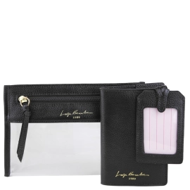 O kit viagem Luiza Barcelos é ideal para todo tipo de viagem, com uma necessaire de couro e vinil transparente, um porta passaporte e uma tag de mala também em couro