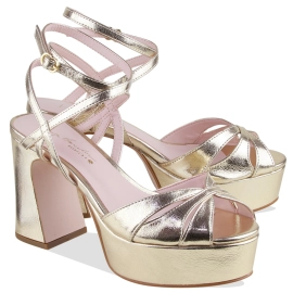 Descrição O modelo com delicadas tiras ganha um toque de atitude extra com o salto grosso, sem falar na sofisticação do acabamento metalizado - é a prova de que é possível arrasar no look de festa sem perder em conforto!