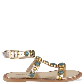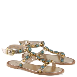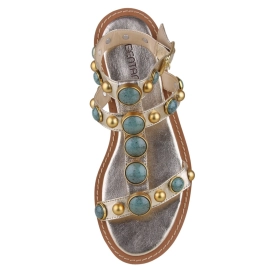 Descrição Para um toque de elegância e sofisticação para o verão, aposte na sandália rasteira com aplicações de pedras multicoloridas. O modelo é produzido em couro metalizado, na tira central tira central que vai até o peito do pé possui aplicações de pedras multicoloridas, bico redondo e fechamento por fivela de ajuste no tornozelo.