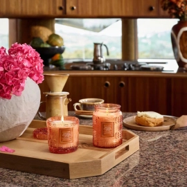 Descrição Uma mistura única de cera criada pela Voluspa utilizando um blend de ceras naturais de coco e damasco, numa linda embalagem de vidro com os detalhes da linha Vermeil.